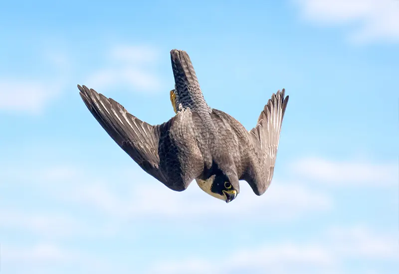 Le faucon pèlerin est un oiseau de proie particulièrement admiré pour ses prouesses. Il faut savoir que ce rapace de taille moyenne est considéré comme l'oiseau le plus rapide du monde. Certains prétendent qu'il pourrait approcher des 400km/h en piqué, mais dans la plupart des cas il plonge jusqu'à 200km/h, ce qui est quand même assez spectaculaire.